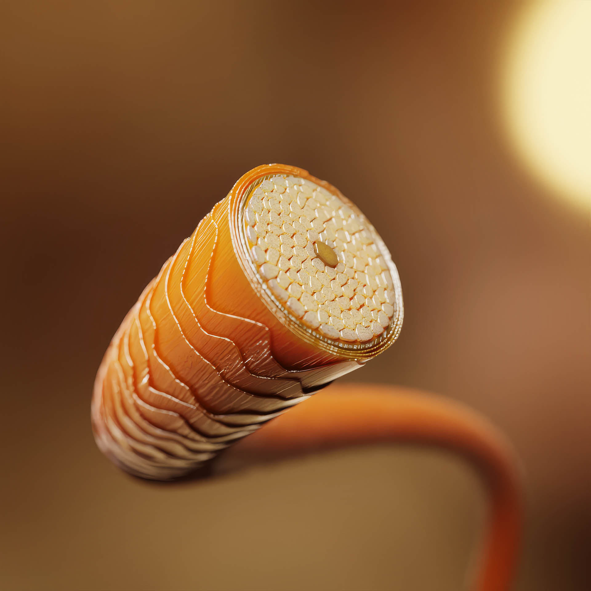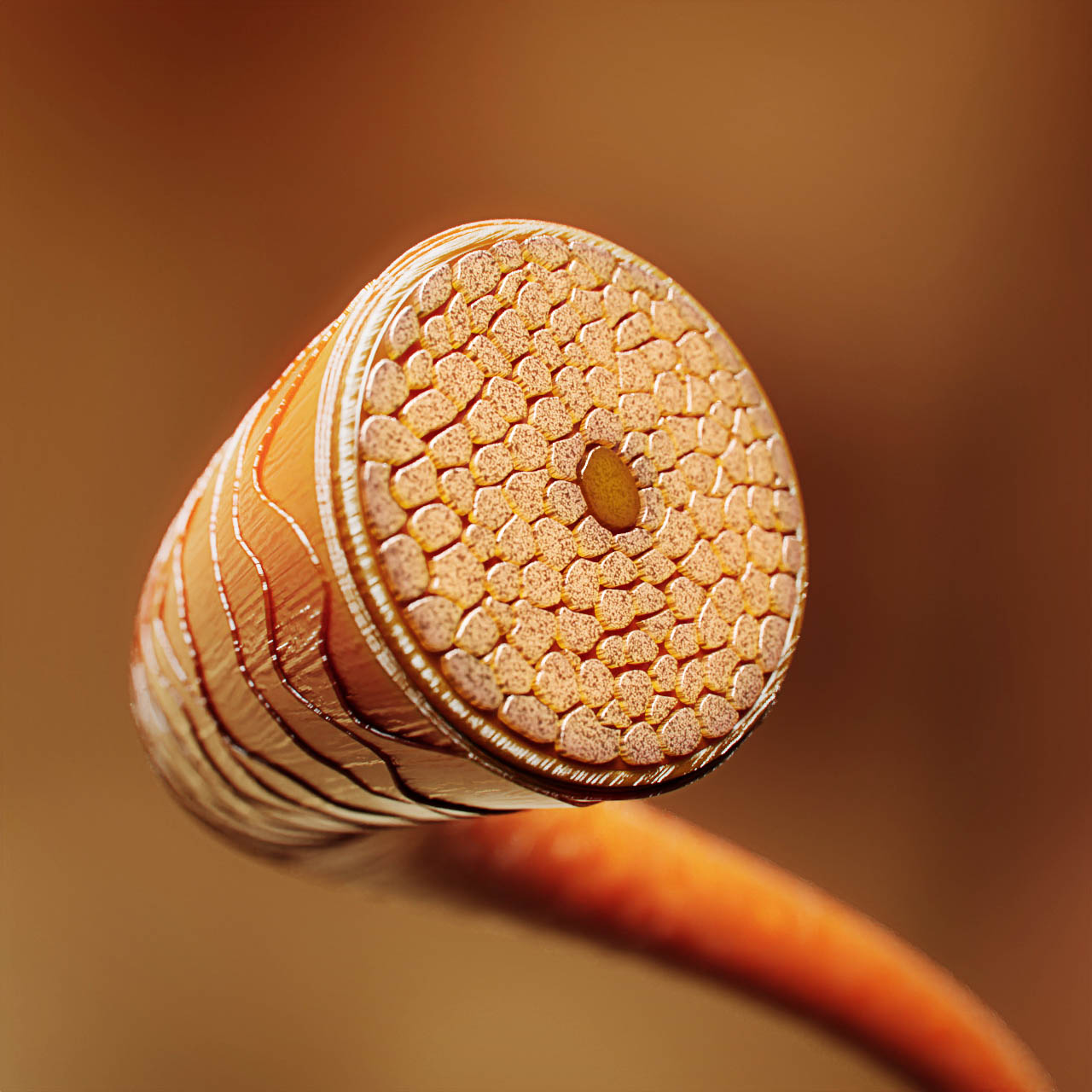 As part of a pitch for a edutainment video for a hair-care client, we developed a highly detailed three-dimensional model of a human hair strand. The model was created to clearly and accurately illustrate the hair’s structure and its complex composition at a macro level.