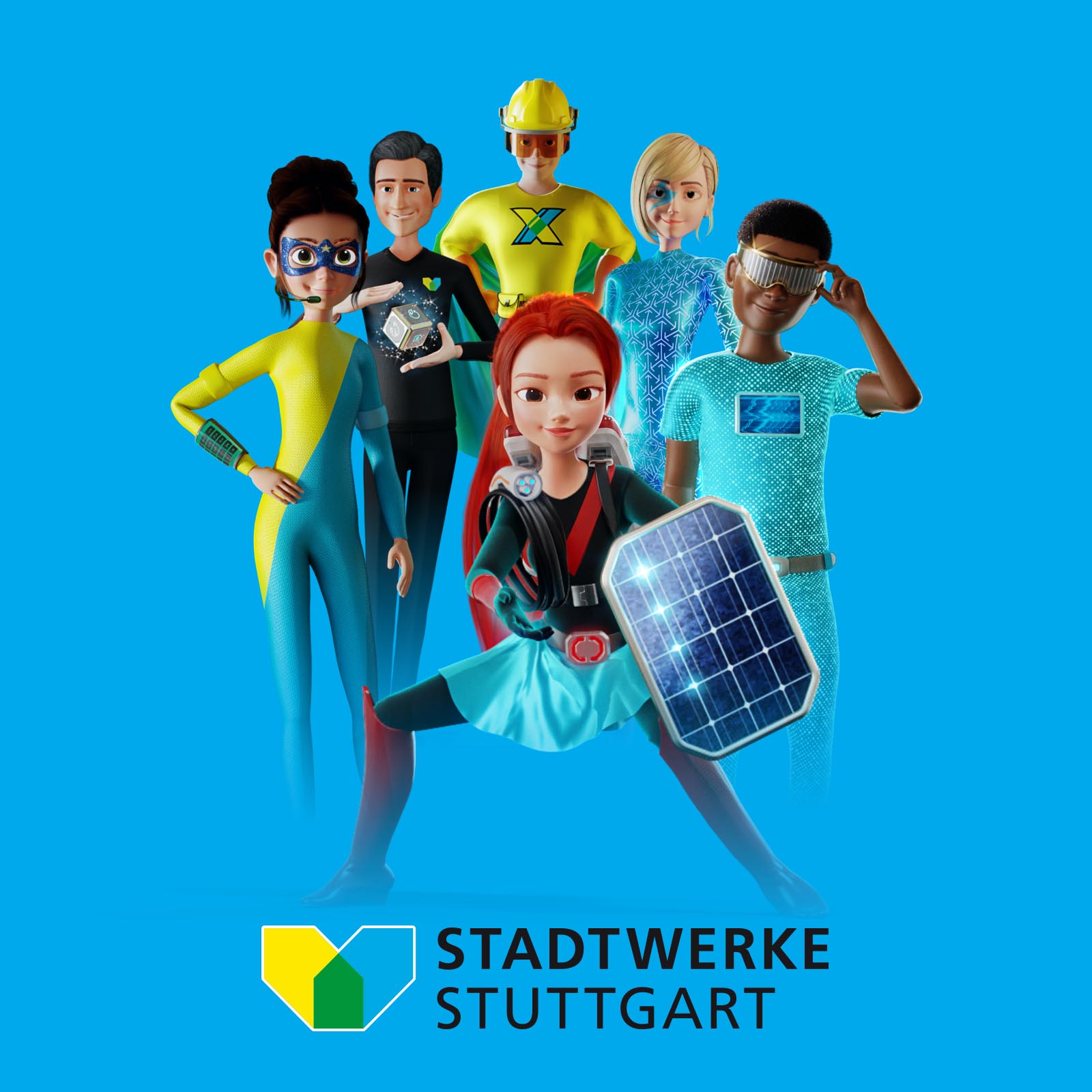 For the Stadtwerke Stuttgart/Stuttgart Netze, we developed a series of 3D comic characters, each embodying an exaggerated symbolic superpower representing the strengths of their workforce. These dynamic characters were brought to life in various poses and scenarios, highlighting their unique abilities. The visuals were used for a range of purposes, including recruitment campaigns to attract new talents.
